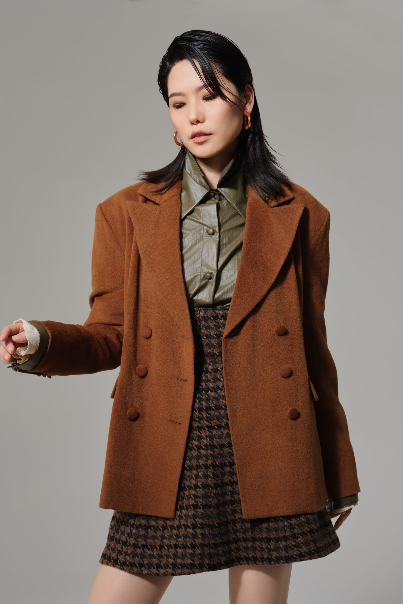 【廓形双面呢西装】甄选内蒙古羊绒与澳洲美利奴羊毛混纺,以加宽枪驳领与双排六粒钮扣诠释摩登力量。立体隐藏式插袋内衬防静电绸缎,搭配马蹄形后开衩细节,成就当代女性的隐奢美学。